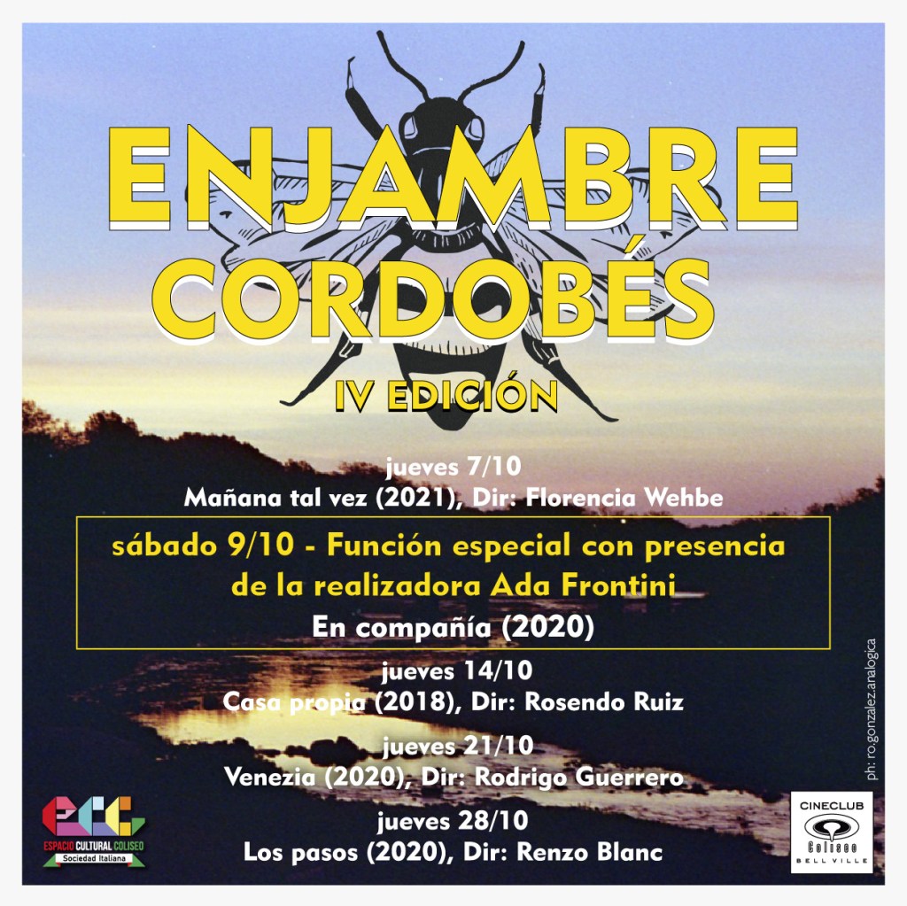 El Cineclub Coliseo está muy feliz porque puede programar el ciclo presencial dedicado al cine cordobés. Las películas seleccionadas este año viajan por distintos lugares de Córdoba e, incluso, cruzan el charco para llegar a Italia.Podremos disfrutar de «Mañana tal vez», ópera prima de Florencia Wehbe; tendremos función especial con la presencia de Ada Frontini, reconocida cineasta bellvillense, quien presentará «En compañía», documental que indaga el amor entre las personas y los perros; nos reencontramos con Rosendo Ruiz, en esta oportunidad con el film «Casa Propia»; viajamos a «Venezia», dirigida por Rodrigo Guerrero en una coproducción Argentina, Italia y Francia; y nos despedimos del ciclo con «Los Pasos», una película de Renzo Blanc. El Enjambre Cordobés llegó zumbando, como las abejas.