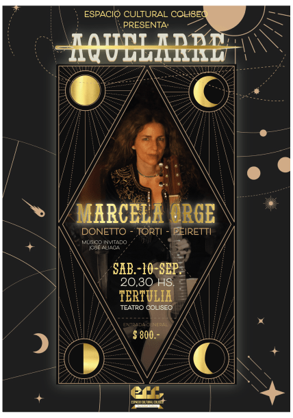 El primer concierto del ciclo será el sábado 10 de septiembre, con la presentación de la artista Marcela Orge, junto a su actual formación integrada por Matías Donetto, Mauricio Peiretti e Iván Torti. Como músico invitado participará José Aliaga en clarinete y coros.