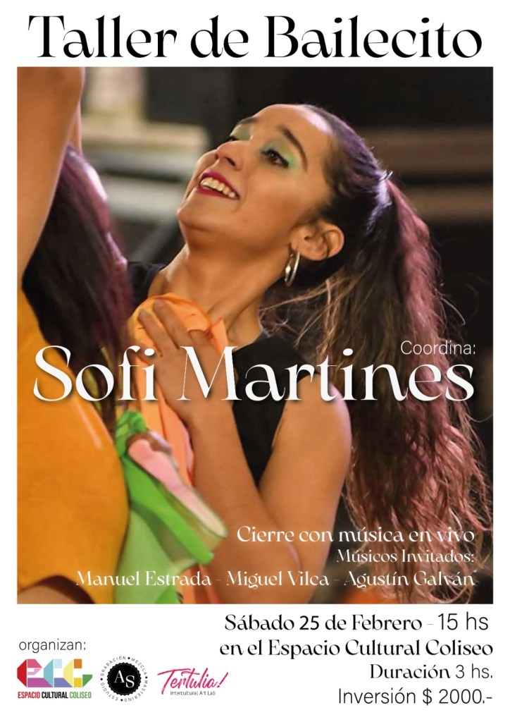 El mismo sábado 25, Sofi Martinez coordina un Taller de Bailecito, con un duración de tres horas y el cierre con música en vivo, para sentir toda la potencia de esta danza folclórica andina, aún vigente en el norte de Argentina.