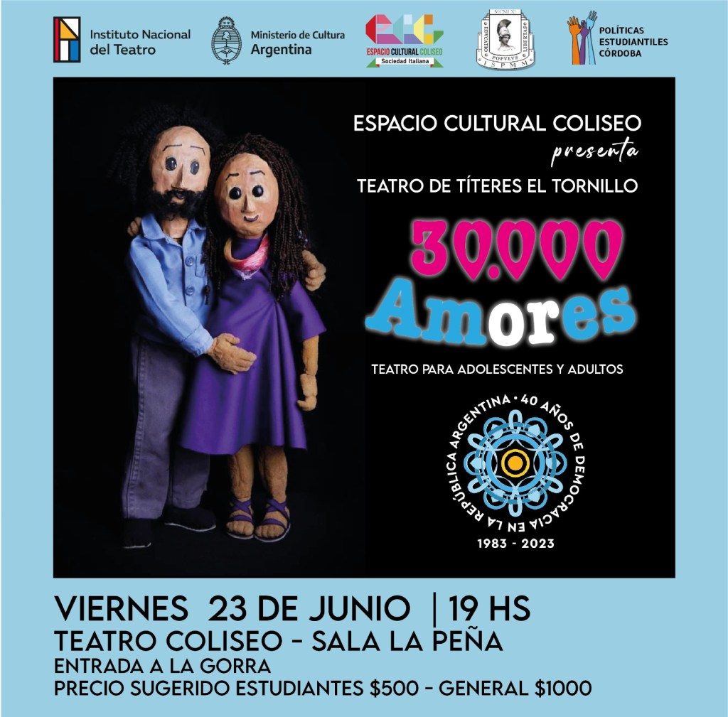 El viernes 23 de junio, a las 19, se presenta la obra de títeres 30.000 amores del grupo El Tornillo en la sala La Peña (segundo piso del Teatro Coliseo). Se trata de una propuesta para público joven y adulto que cuenta una historia de amor profunda, entre dos jóvenes solidarios, idealistas y comprometidos con su tiempo.